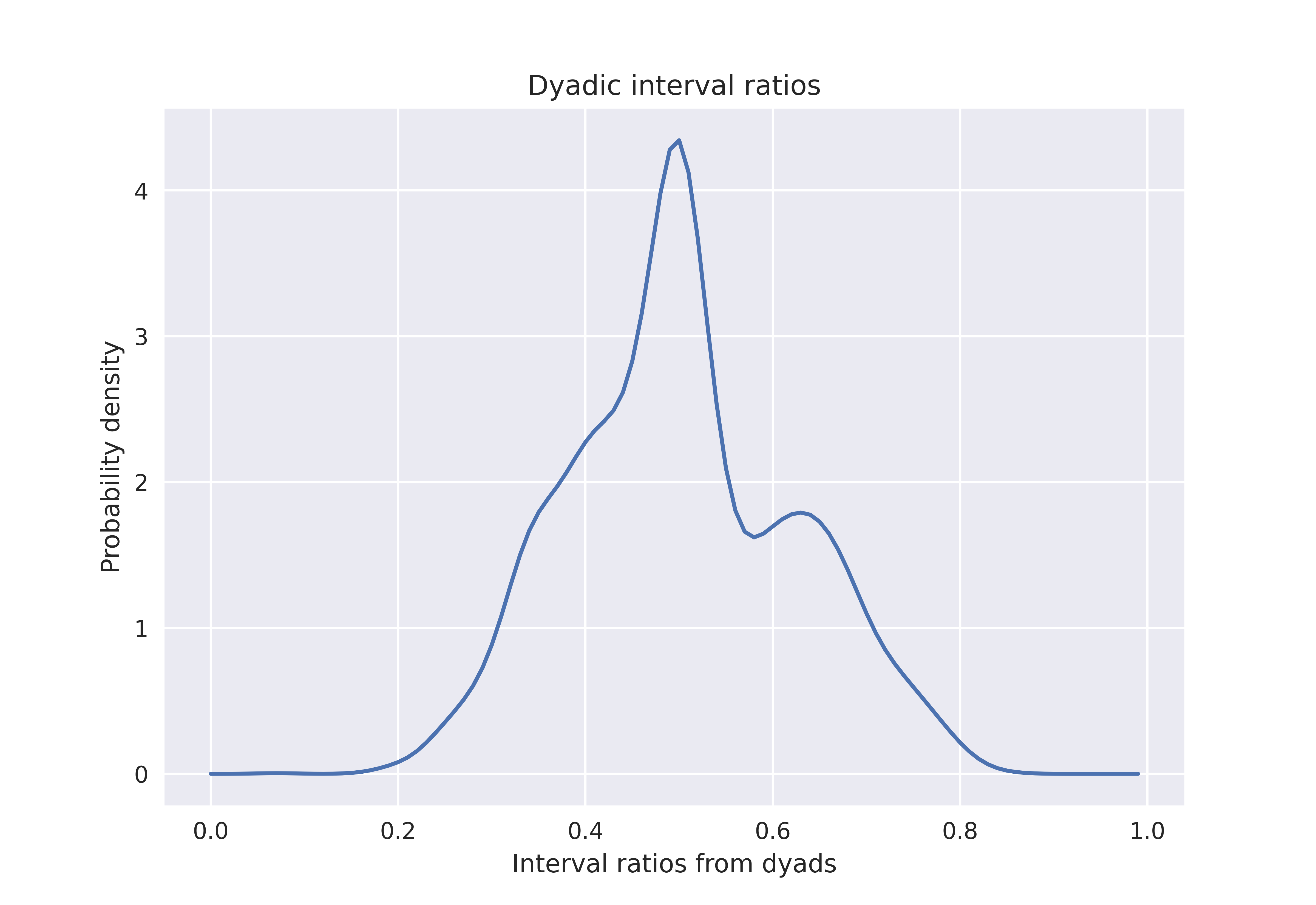 - thebeat.visualization.plot_interval_ratios_density(sequence, resolution=0.01, style='seaborn-v0_8', title=None, x_axis_label='Interval ratios from dyads', y_axis_label='Probability density', figsize=None, suppress_display=False, dpi=100, ax=None)[source]#